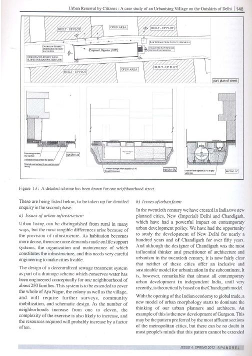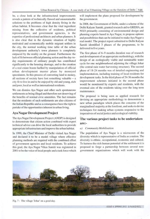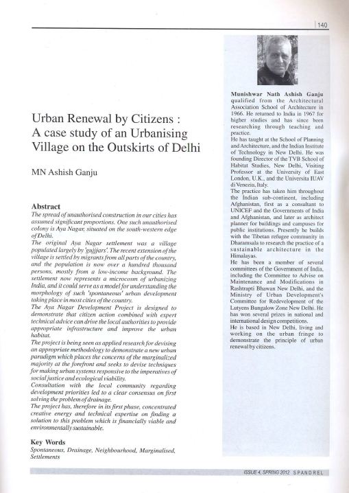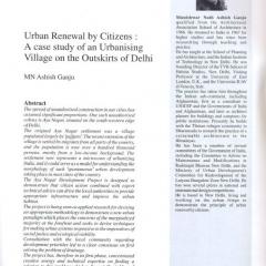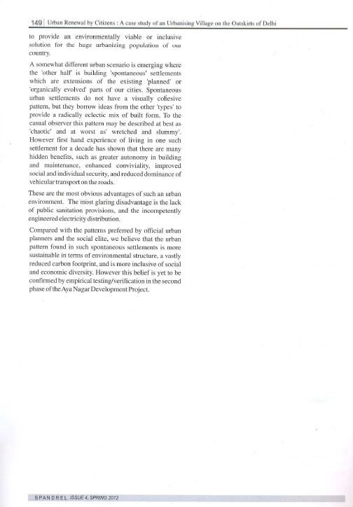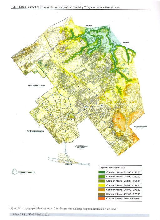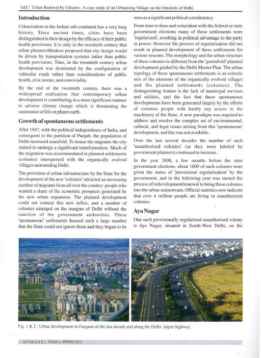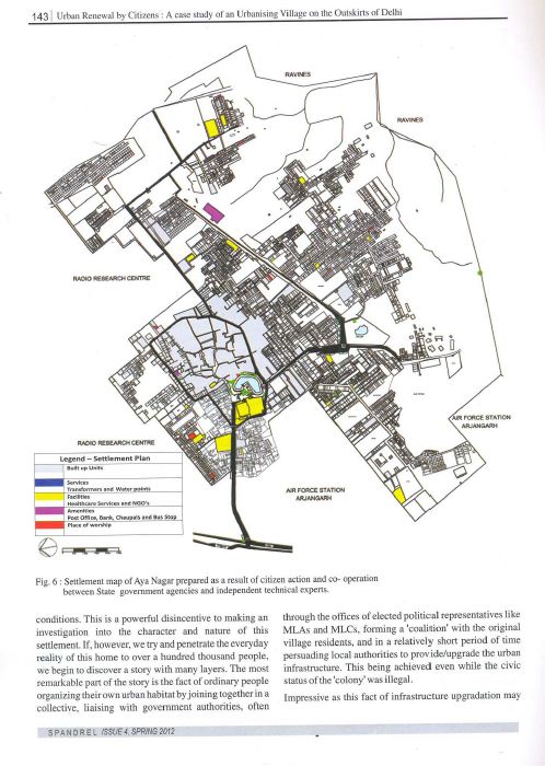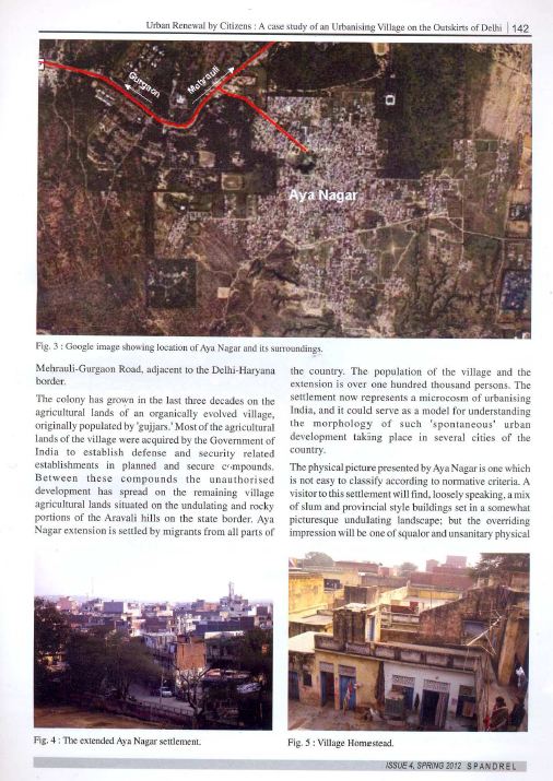 The original Aya Nagar settlement was a village populated largeley by 'gujjars'. The recent extension of the village is settled my migrants from all parts of the country, and the population is now over a hundred thousand persons, mostly from a low- income background. The settlement now represents a mocrocosm of urbanising India, and it could serve as a model for understanding the morphology of such 'spontaneous' urban development taking place in most cities of the country