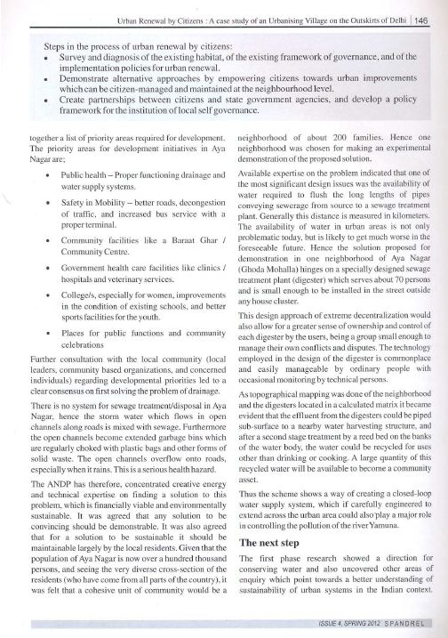 The Aya Nagar Development Project is designed to demonstrate that citizen action combined with expert technical advice can drive the local authorities to provide appropriate infrastructure and improve the urban habitat.